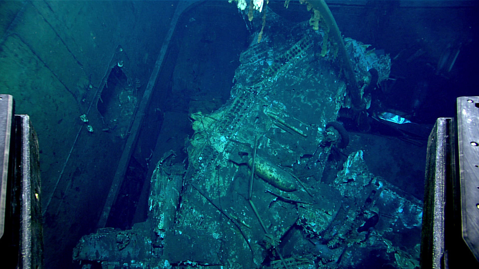 With the incredibly skilled and experienced pilots from the Global Foundation for Ocean Exploration, ROV Deep Discoverer observed Yorktown’s hangar deck by means of the #3 elevator shaft. Deftly avoiding a number of entanglement hazards, ROV cameras soon revealed the jumbled wreckage of at least three Douglas SBD Dauntless dive bombers resting in the aft starboard quarter. One of the planes, likely part of Yorktown’s reserve force on the first morning of the battle, was seen fully armed, lying inverted with a bomb still secured in the release cradle. Another plane, with the figures “B5” boldly legible on its fuselage, is currently believed to be BuNo 4581, an SBD-3 assigned to Bombing Squadron Six from USS Enterprise (CV-6). Records show that in the chaos of battle, Yorktown recovered two Enterprise aircraft that had been badly damaged in an attack on the Imperial Japanese Navy carrier Kaga. These refugee aircraft were moved down to the hangar deck and later set afire by one of three enemy bombs that struck Yorktown. Research is ongoing to determine definitively if 6-B-5 was indeed one of the two Enterprise dive bombers lost with her sister ship. Research provided by Russ Matthews, Air/Sea Heritage Foundation.