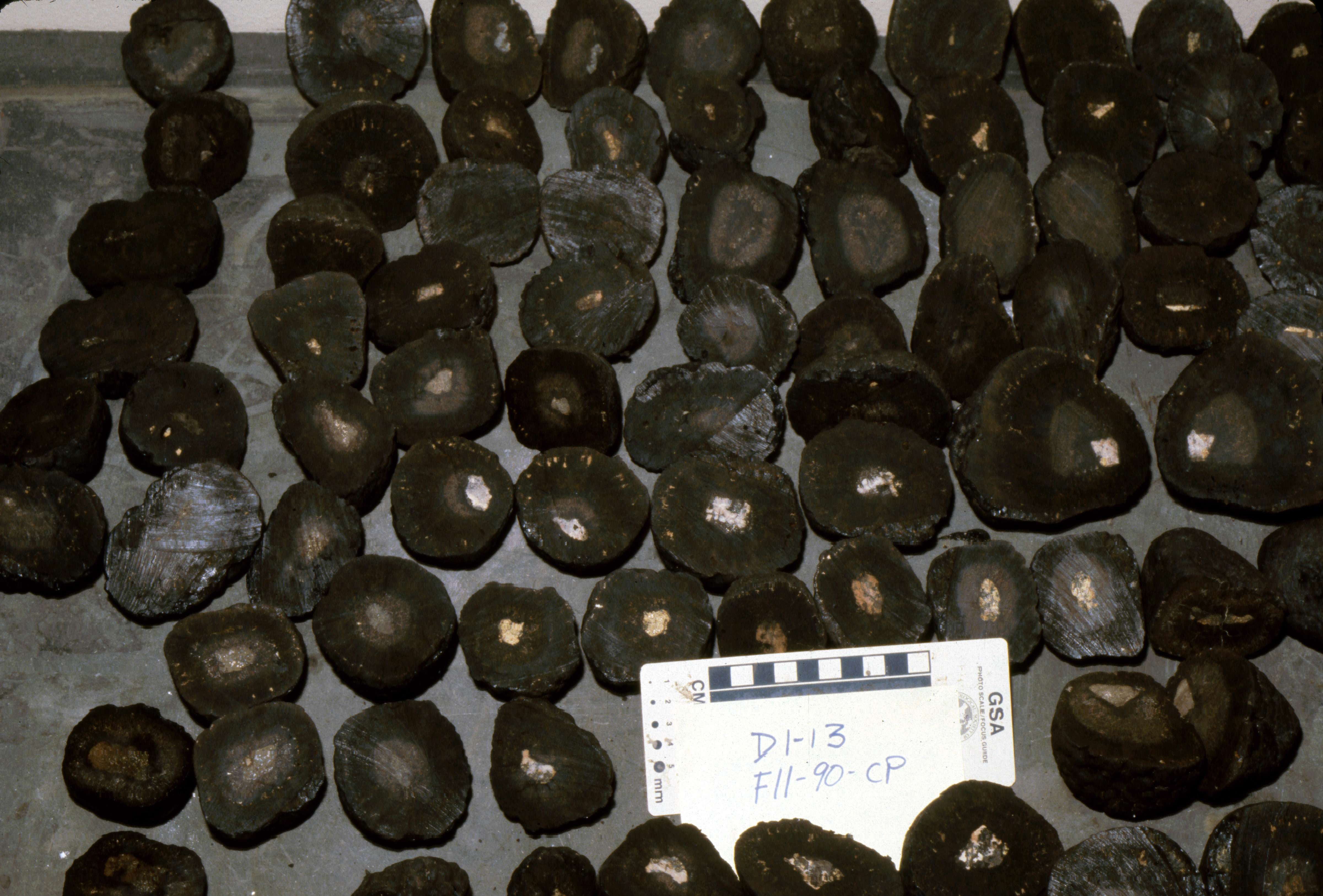 But what is a nodule? Geologically speaking, nodules are defined as round or spherical concretions of rock. In marine geology, more specifically, the term usually refers to manganese nodules, a mineral type that forms by accreting in concentric layers around a fragment of some other rock or biological material, called a nucleus. When a manganese nodule is cut in half, the circular layers around the nucleus are reminiscent of tree rings.