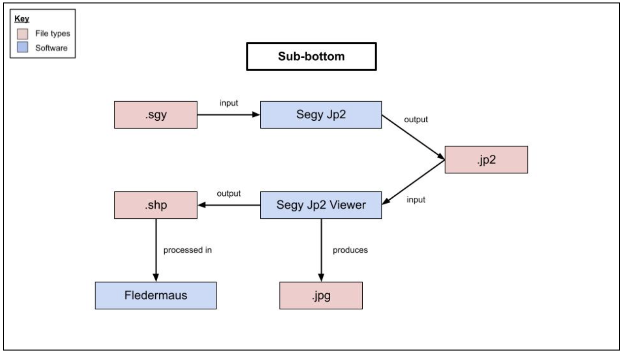 This flowchart depicts the process and tools used to create sub-bottom images, like the one pictured below. Step one is converting a .sgy file to a .jp2 file in the software, Segy Jp2. Step two is using Segy Jp2 Viewer to convert that product into a .shp file. This is viewed in Fledermaus to close gaps between data lines, if any (step three). Finally, back in, Segy Jp2 Viewer, we export the data as a .jpg.