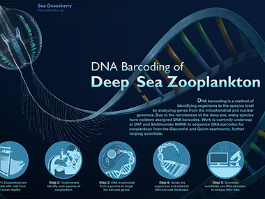 This expedition built on the team’s previous work in the region, with the goal of improving understanding of the diversity and distribution of these deep-ocean animals. To help achieve this goal, they used state-of-the-art acoustic sensing and sampling methods, including a variety of plankton net systems and a towed imaging system, with a focus on the waters around two seamounts near the edge of the U.S. Exclusive Economic Zone: Giacomini and Quinn.