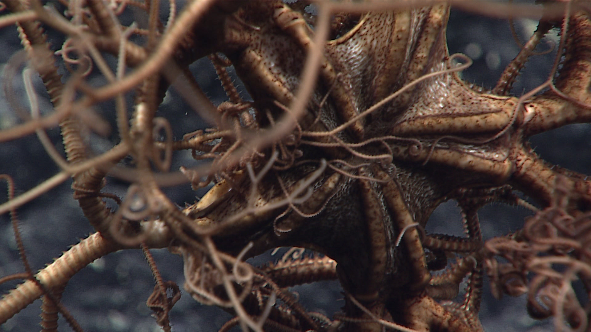 This image shows the intricate arms of a basket star, imaged during the fourth dive of the 2016 Hohonu Moana: Exploring Deep Waters off Hawaiʻi expedition to explore a headwall scarp on the north side of Pioneer Bank. Basket stars are close relatives of brittle stars and feed by perching in an elevated position and extending their arms in a net-like fashion perpendicular to the current to catch small crustaceans, jellyfish, and other small animals that come within reach.