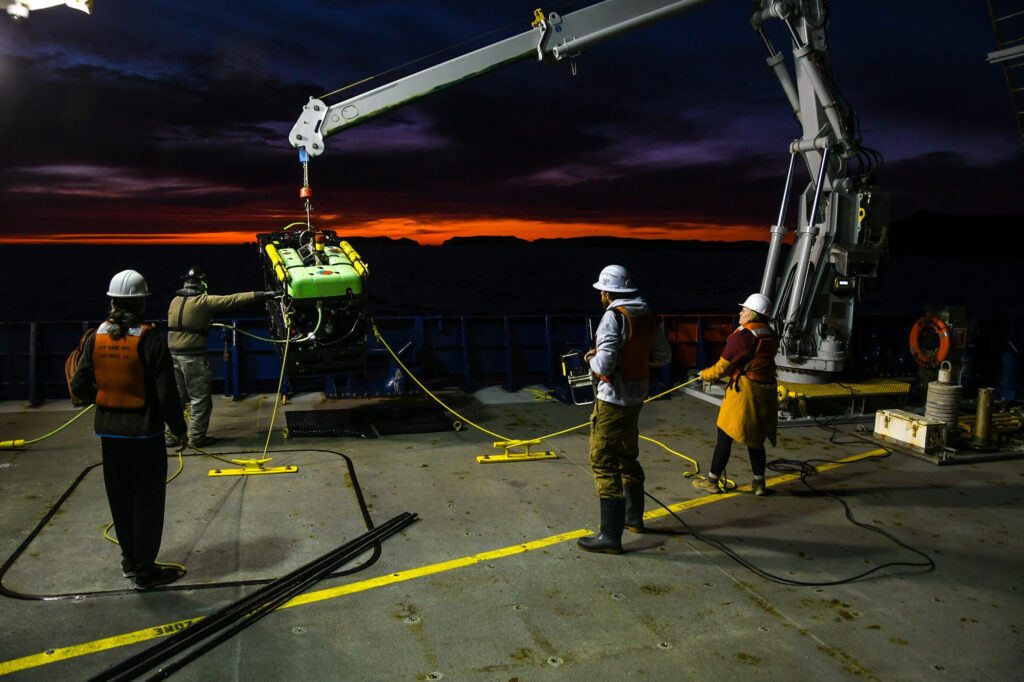 The Student Explorations Around Southern California: Acoustics, Paleolandscapes, and Environments at Sea (SEASCAPES) project science team and Research Vessel Sally Ride crew deploy remotely operated vehicle Beagle for a dive off Anacapa Island.