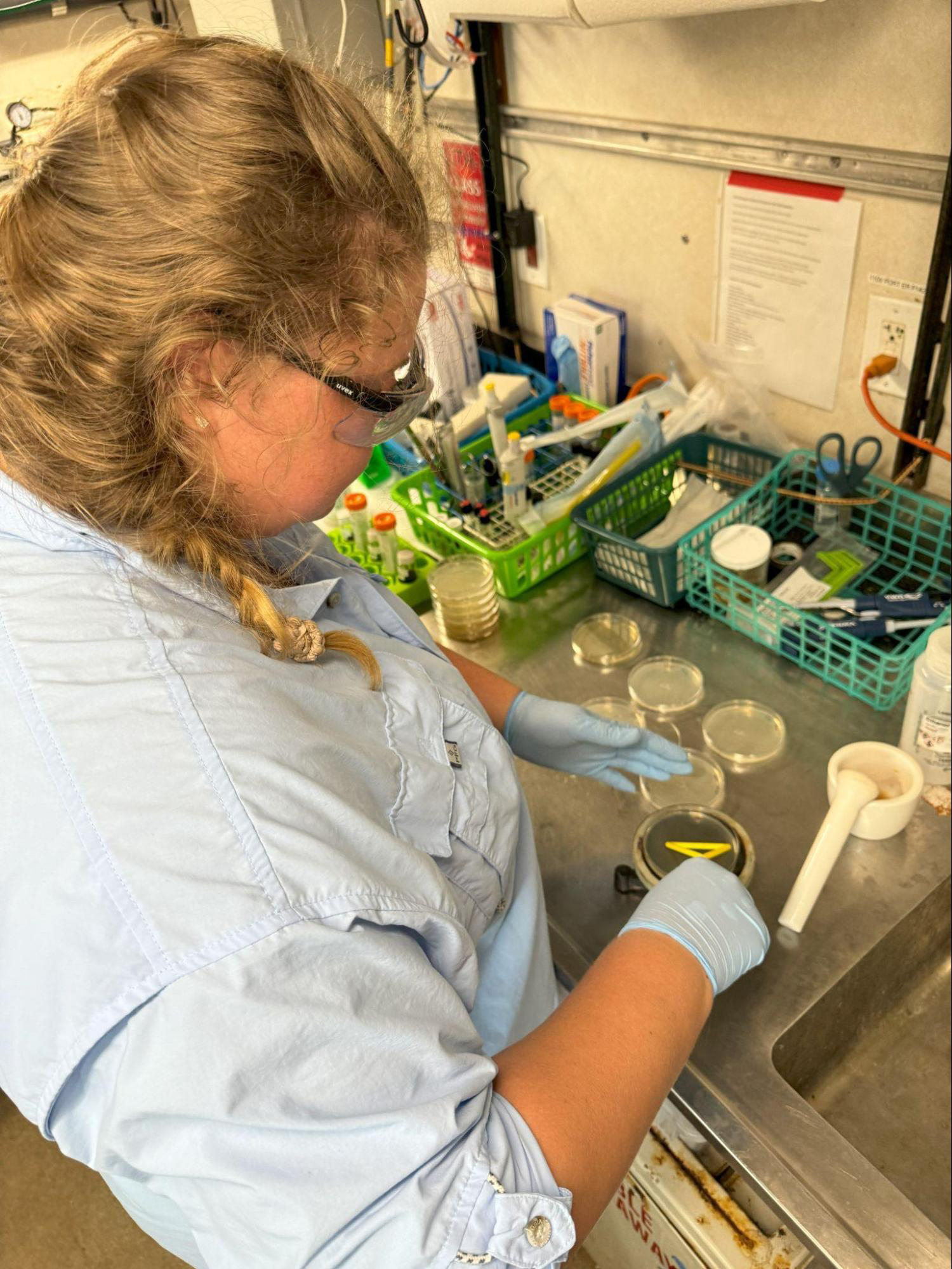 Kirstie Francis processes sponge subsamples in the ship’s wet lab, placing them in prepared petri dishes with a media that encourages the growth of diverse microbes.