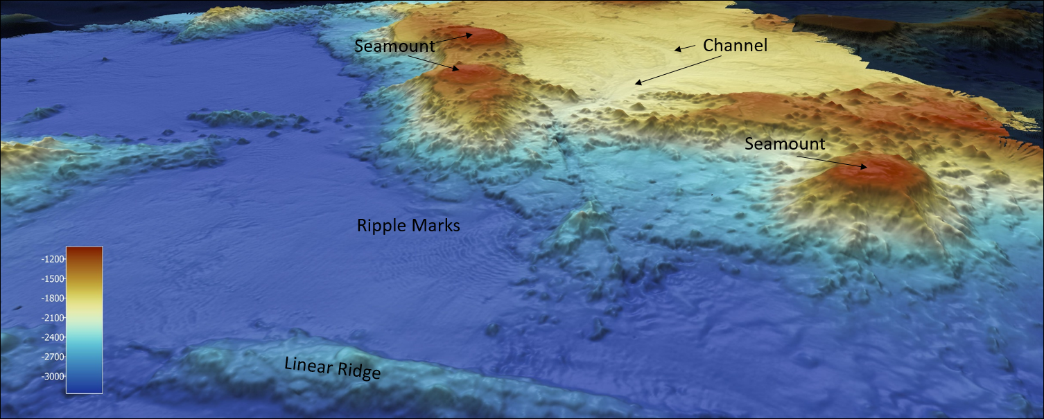 A bathymetric map of several volcanic and fluvial features, including seamounts, a linear ridge, ripple marks, and channel ways, mapped during the second Johnston Atoll Mapping expedition. The cooler colors indicate a deeper depth, and the warmer colors a shallower depth, at a 2:1 ratio.