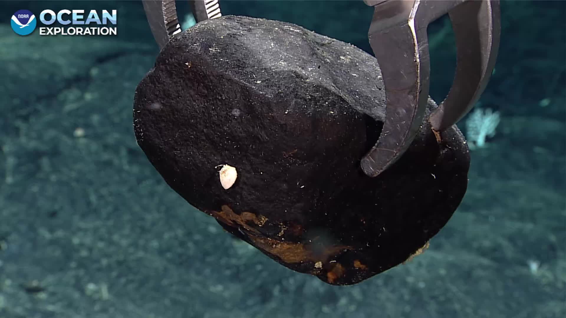 One of two geological samples collected on the fifth dive of the Papahānaumokuākea ROV and Mapping expedition collected at 1,117 meters (3,664 feet). An attached brachiopod (lantern shell) was also collected and preserved for genetic analysis.